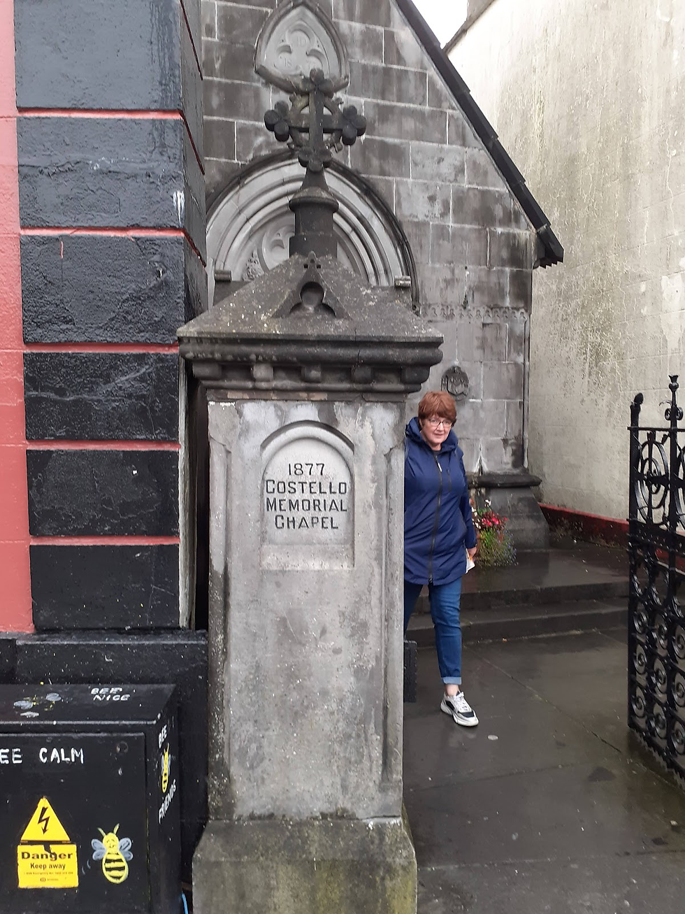 Here is located, overshadowed by recent constructions, the Costello Memorial Chapel, considered the second smallest chapel in the world. If you ask me, it's not particularly notable except for being a labor of love. Edward Costello had it built in the late 19th century in memory of his wife Mary Josephine. Their embalmed bodies lie side by side under a thick glass slab inside. A few meters away stands the town clock, a monument erected in 1905 in honor of Owen McCann, a prominent town figure and the first chairman of Leitrim County Council.